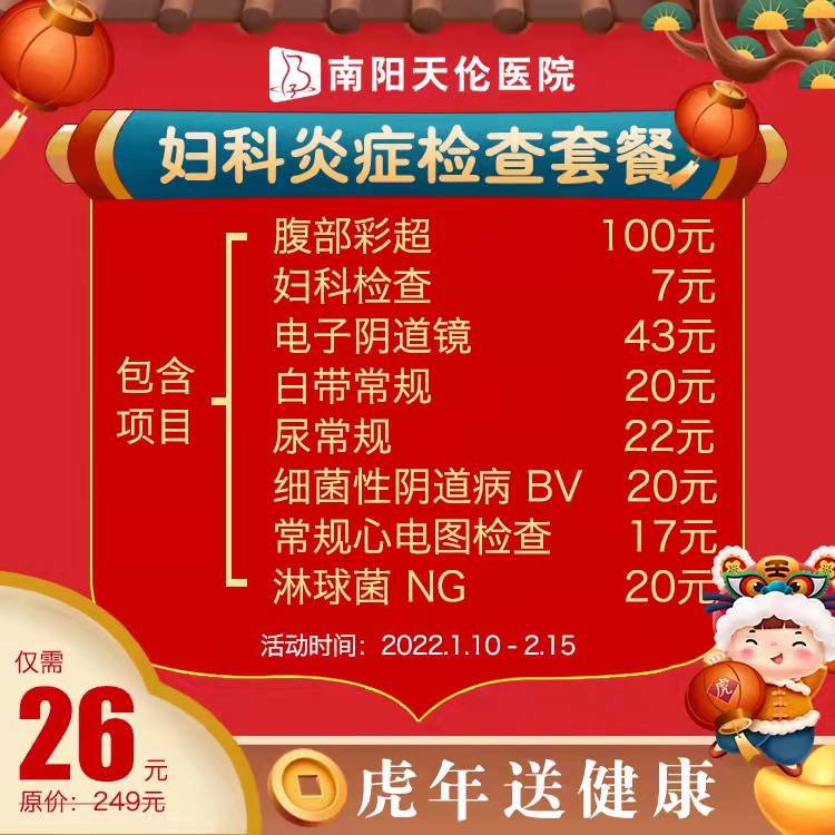 妇科炎症检查套餐26元(原价249元):腹部彩超、妇科检查、电子阴道镜、白带常规、尿常规、细菌性阴道病BV、常规心电图检查、淋球菌NG