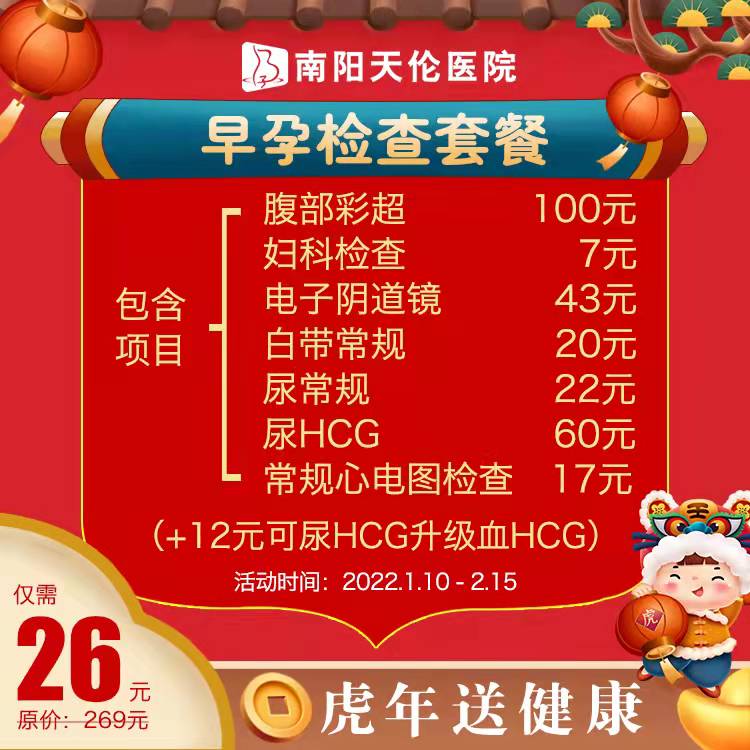 早孕检查套餐26元(原价269元):腹部彩超、妇科检查、电子阴道镜、白带常规、尿常规、尿HCG、常规心电图检查