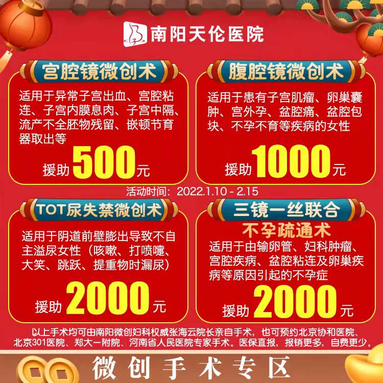 腹腔镜微创术援助1000元:适用于患有子宫肌瘤、卵巢囊肿、宫外孕、盆腔痛、盆腔包块、不孕不育等疾病的女性。