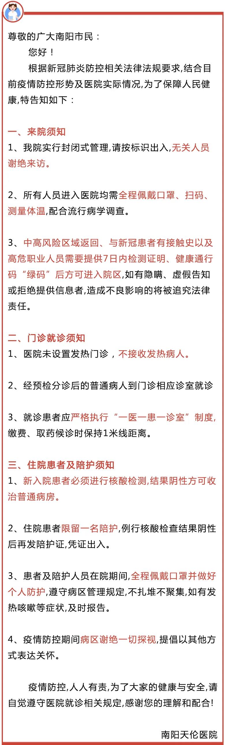 南阳天伦医院疫情防控告知书
