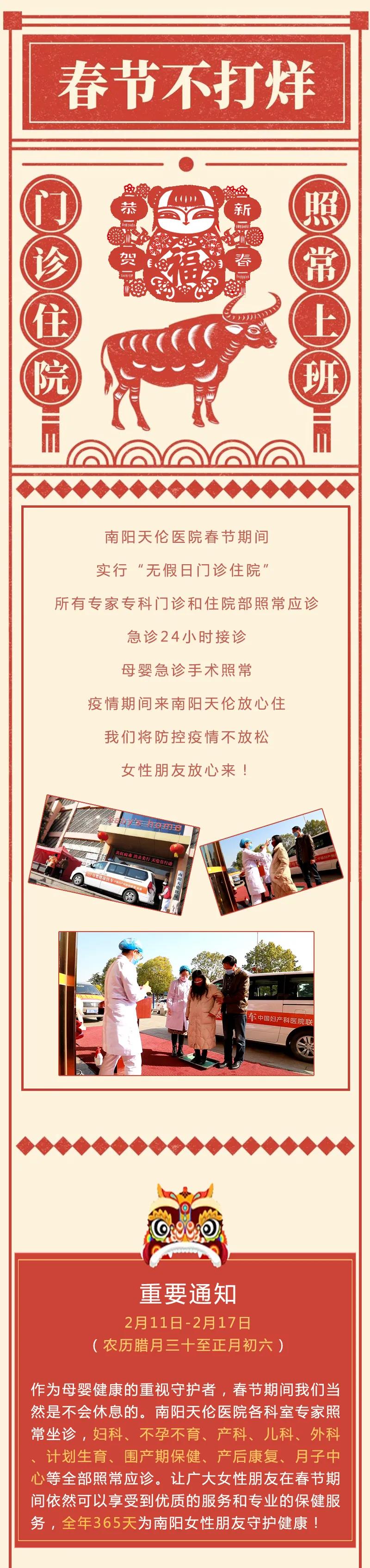 作为母婴健康的重视守护者,春节期间我们当然是不会休息的。南阳天伦医院各科室专家照常